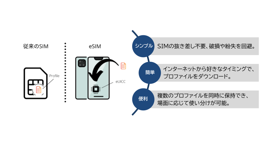 eSIMとは、端末本体に組み込まれており、QRコード読み取りなどの簡単な手順ですぐにご利用開始できる、データ通信SIMです。