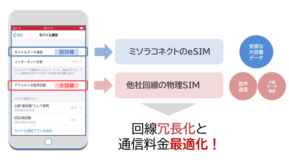 物理SIMとeSIMで複数のプロファイル利用を使い分けることで、回線冗長化料金の最適化が可能です。ご利用方法に応じた最適プランをオーダーメイド出来ます。